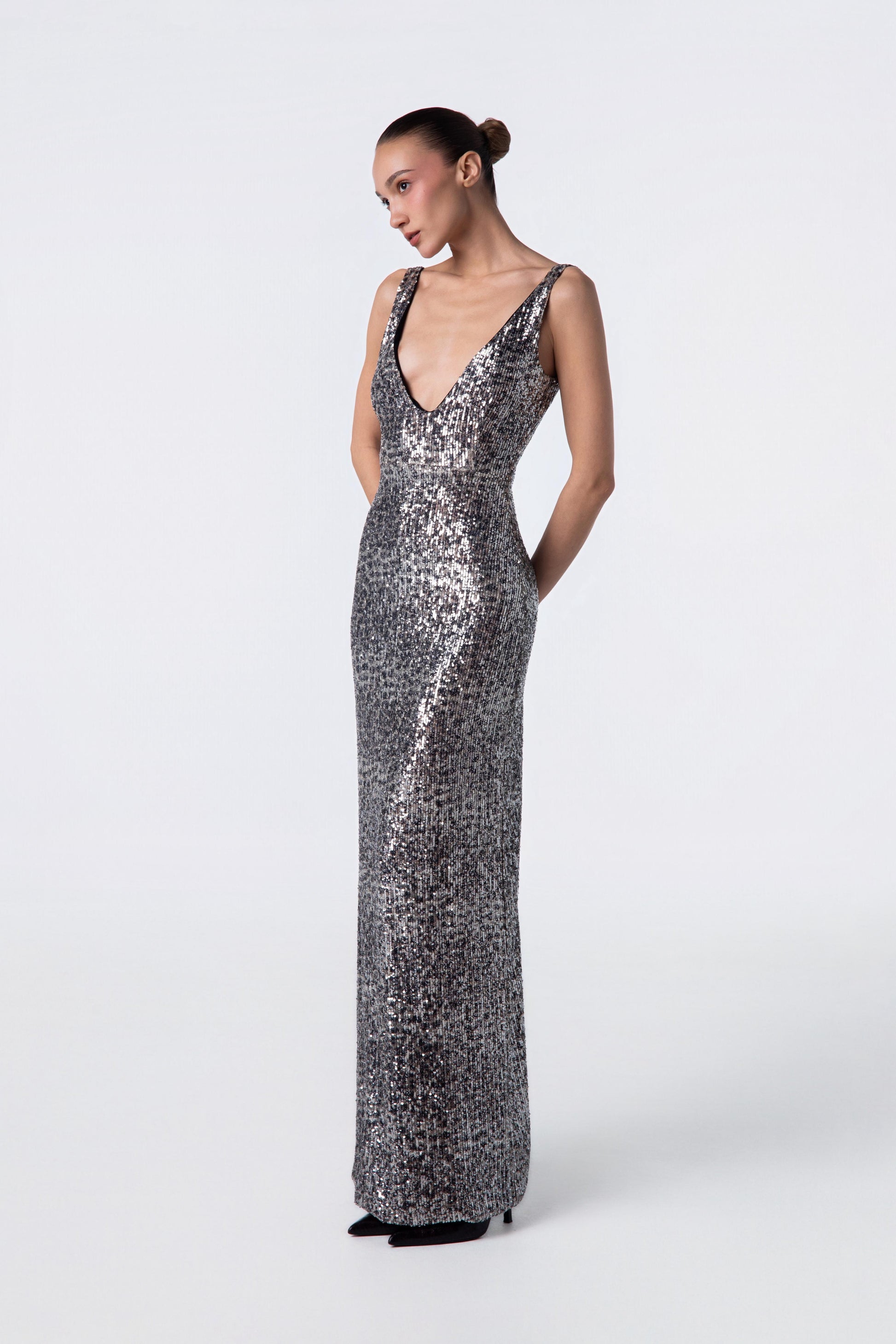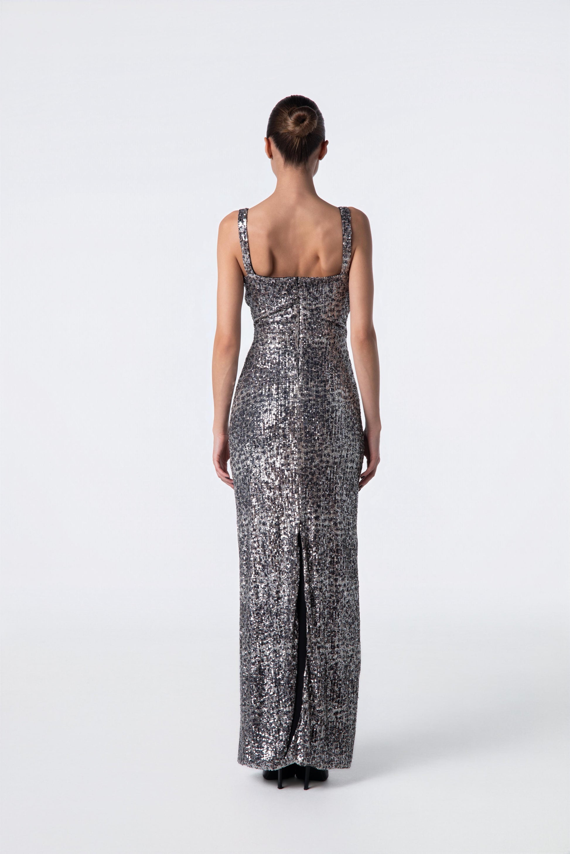 SLEEVELESS GOWN CRAFTED FROM SHIMMERING PAILLETTES.