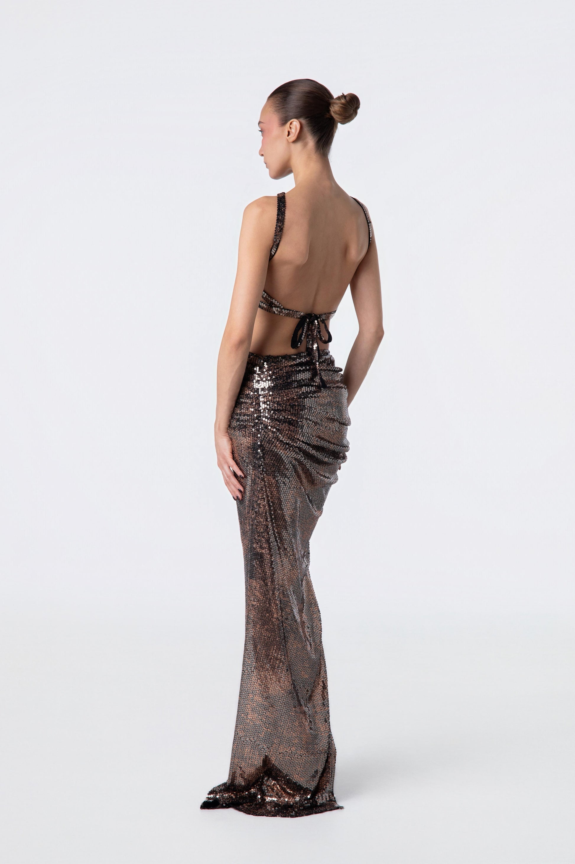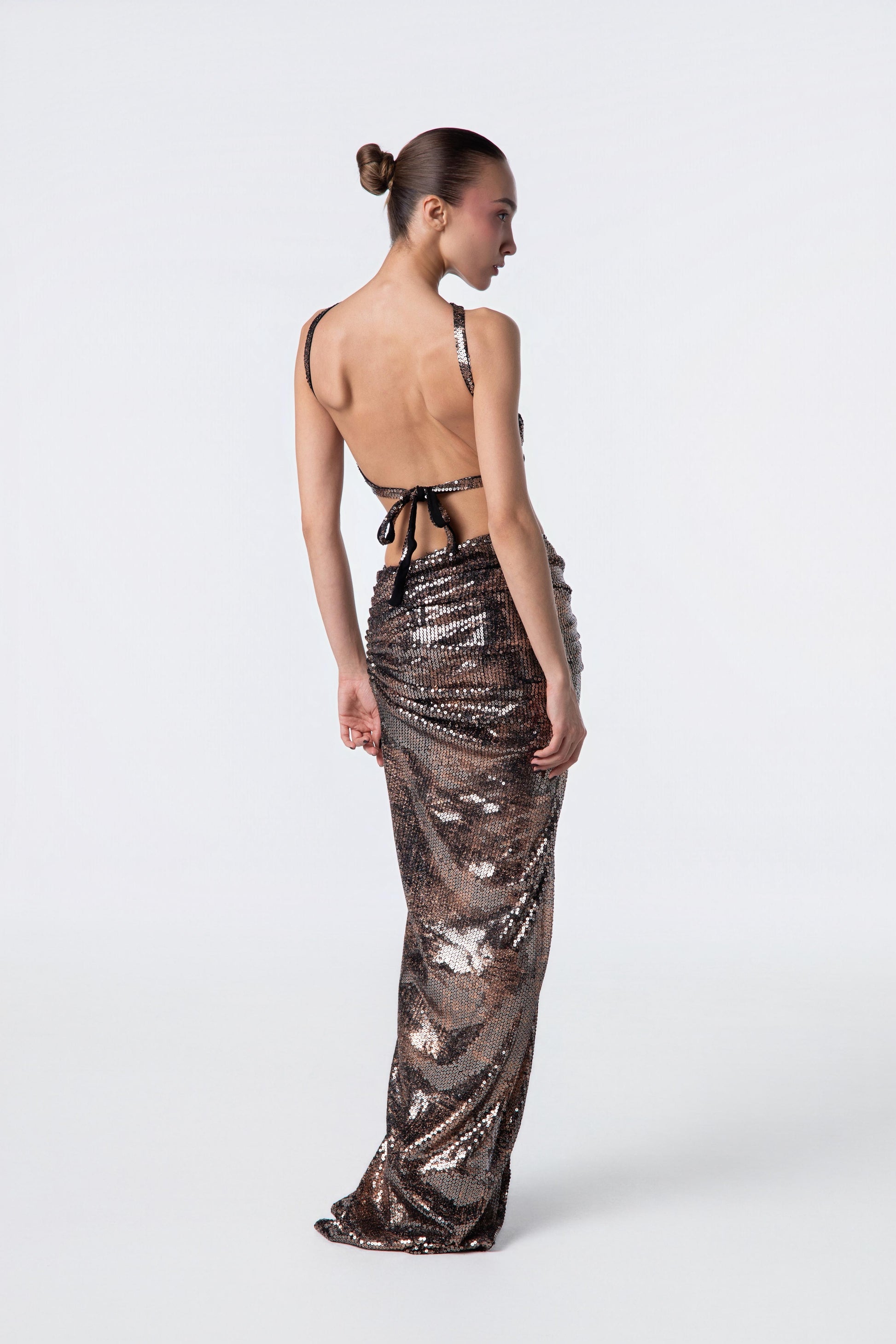 A REFINED TWO-PIECE LOOK COMPOSED OF THE SIGNATURE ORBIT SKIRT PAIRED WITH THE ORBIT HALTER TOP.